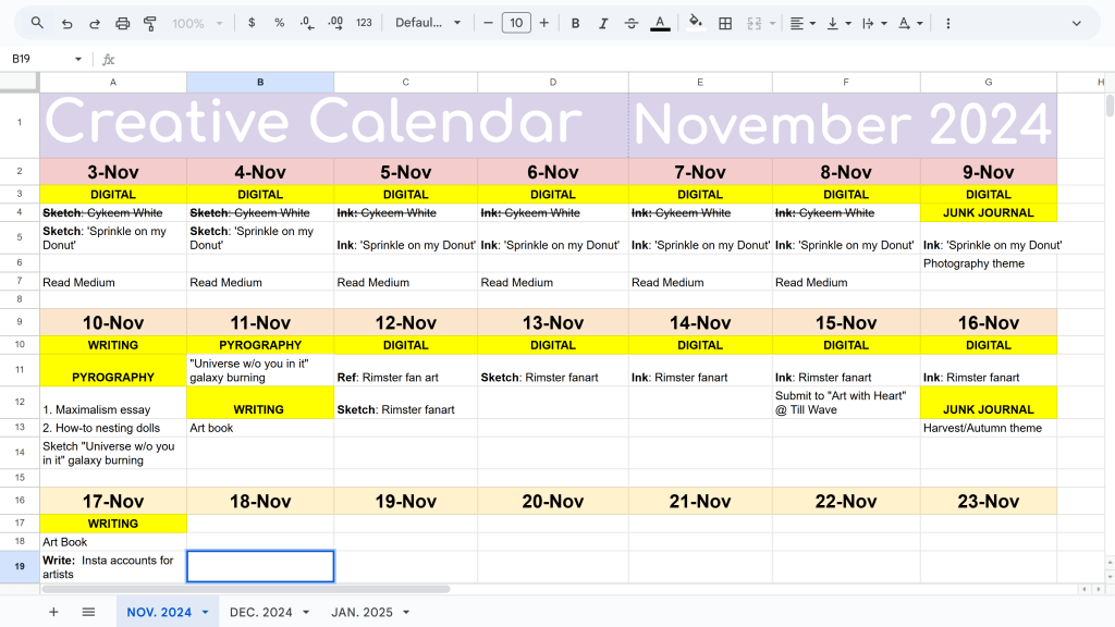 For those wondering how the plan to create a spreadsheet in order to organize my creative chaos is actually going: